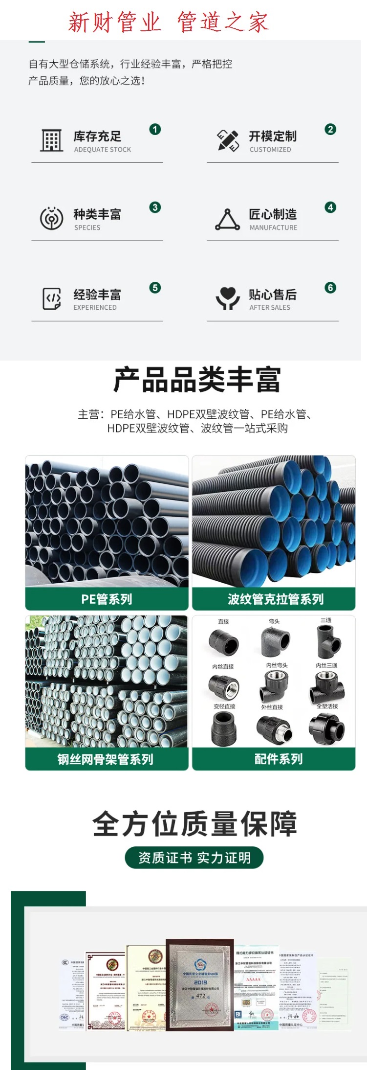 基本分為兩類:低密度聚乙烯LDPE(強度較低);高密度聚乙烯HDPE。PE材料按照際上統一的標準劃分為五個等級:PE32級、PE40級、PE63級、PE80級和PE100級。