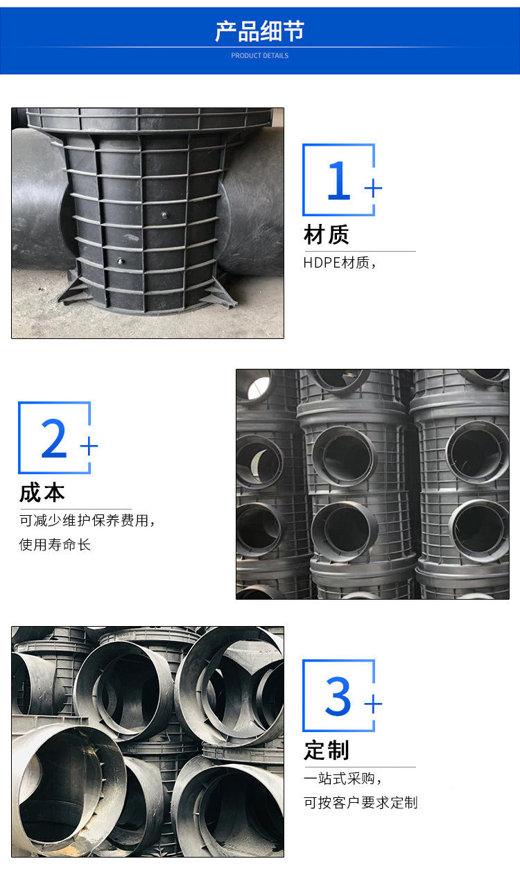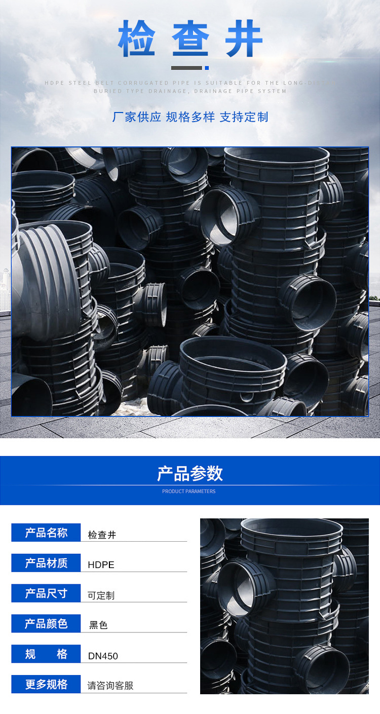 檢查井還可用于電力、光電纜、光纖和其它系統(tǒng),在制作上可根據(jù)要求在任何方向非常簡單的增加新的開孔,以連接不同規(guī)格的支管。相關(guān)